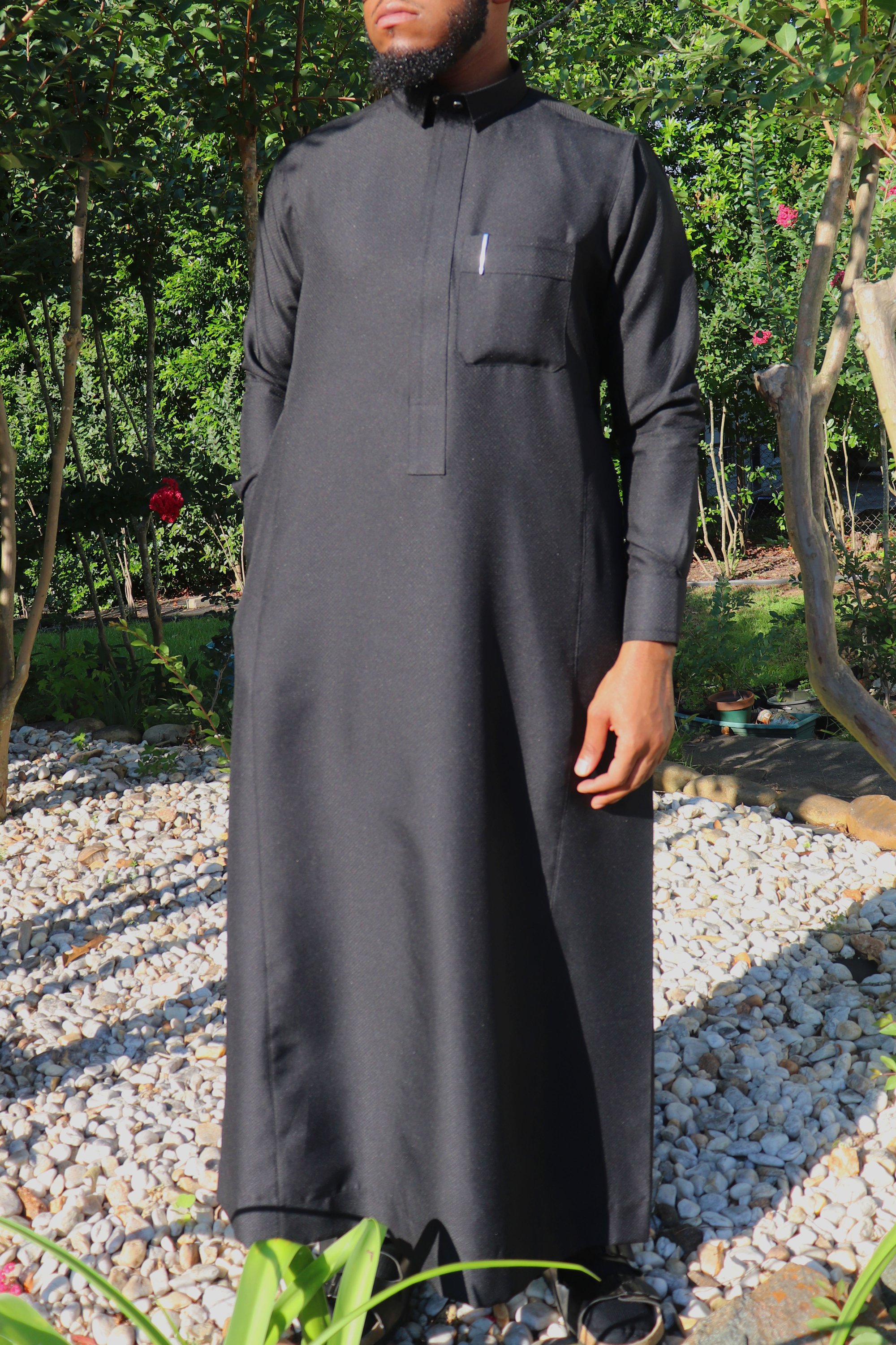 Black thobe with high quality fabric made in Madinah Saudi Arabia. Comes in 6 different lengths and 4 different widths.